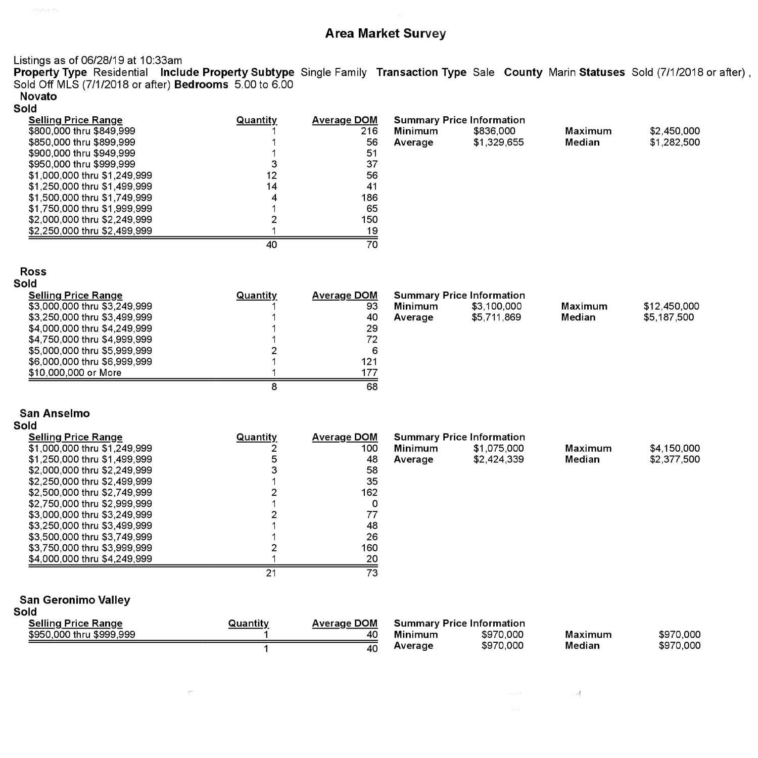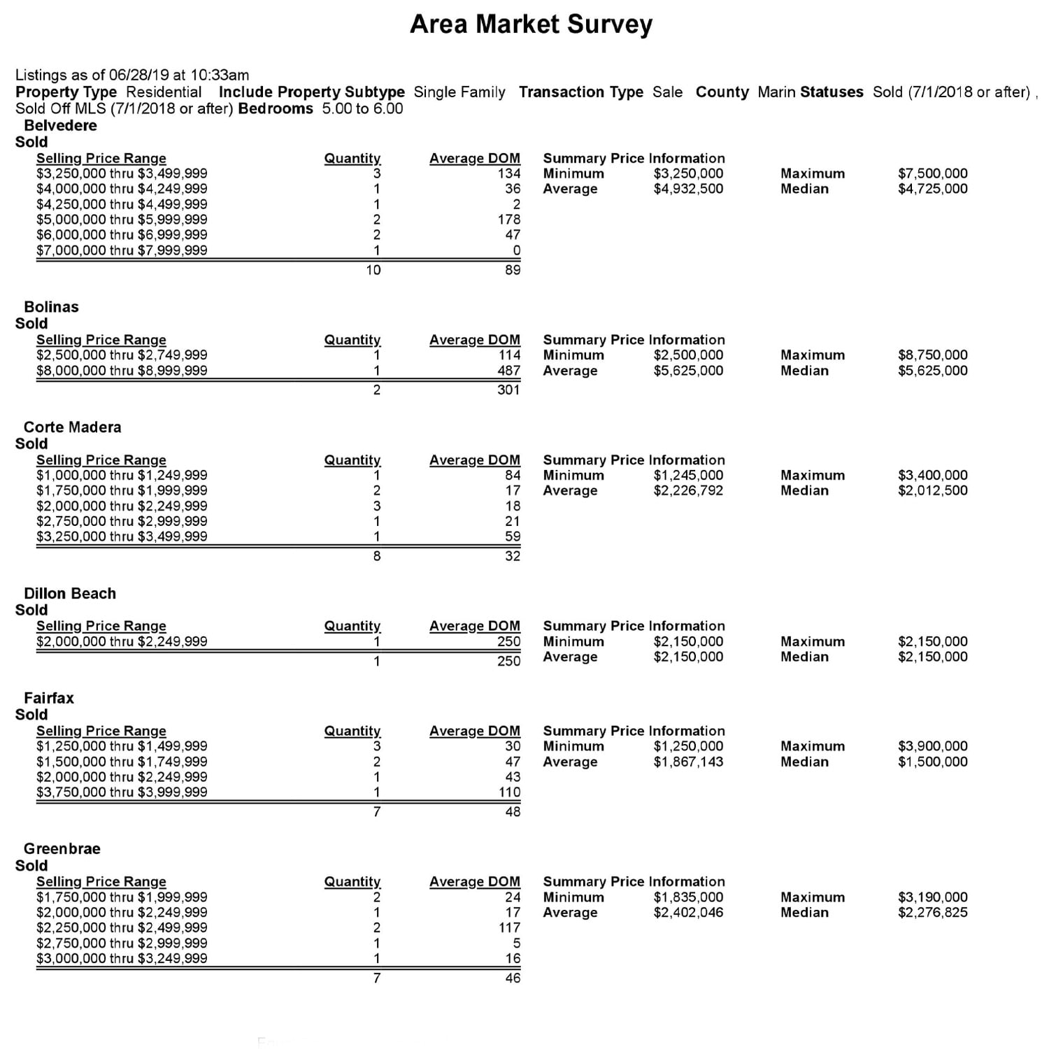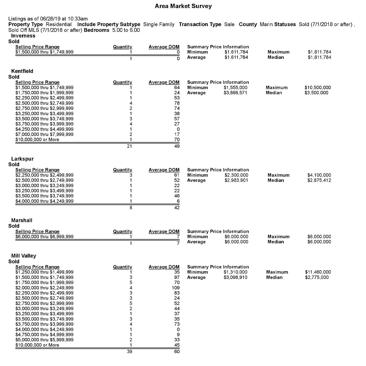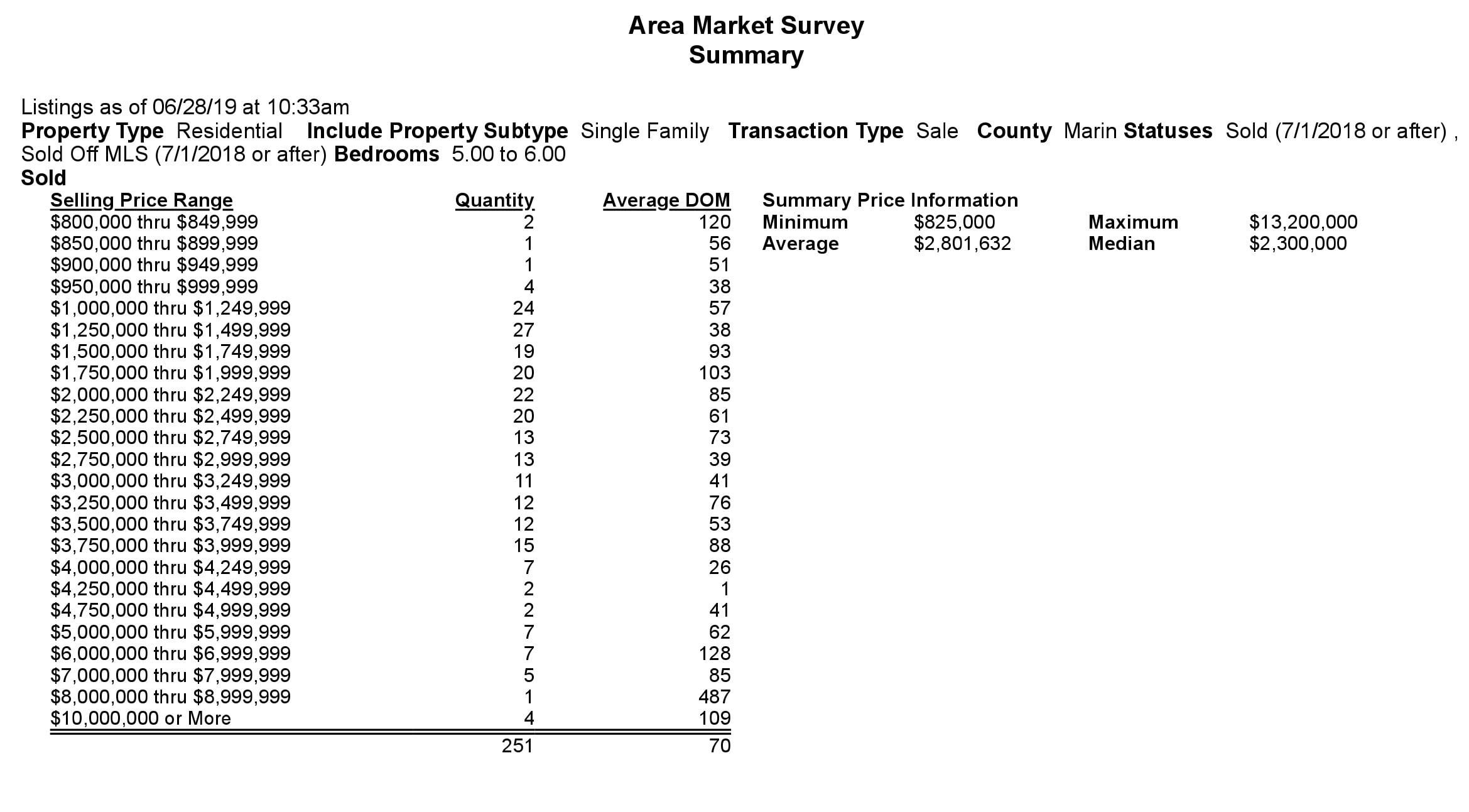 Across all Marin towns, see the number of sales, number of days on market and average sale prices across all price brackets.