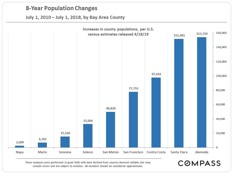 Among Bay Area counties, Marin has ranked second from the last in both total number growth since 2010 (illustrated below), and by percentage increase (2.9%). The 3 North Bay counties have not seen the intense population increases which have occurred in other counties in recent years - and, of course, that is exactly what many of its residents prefer.