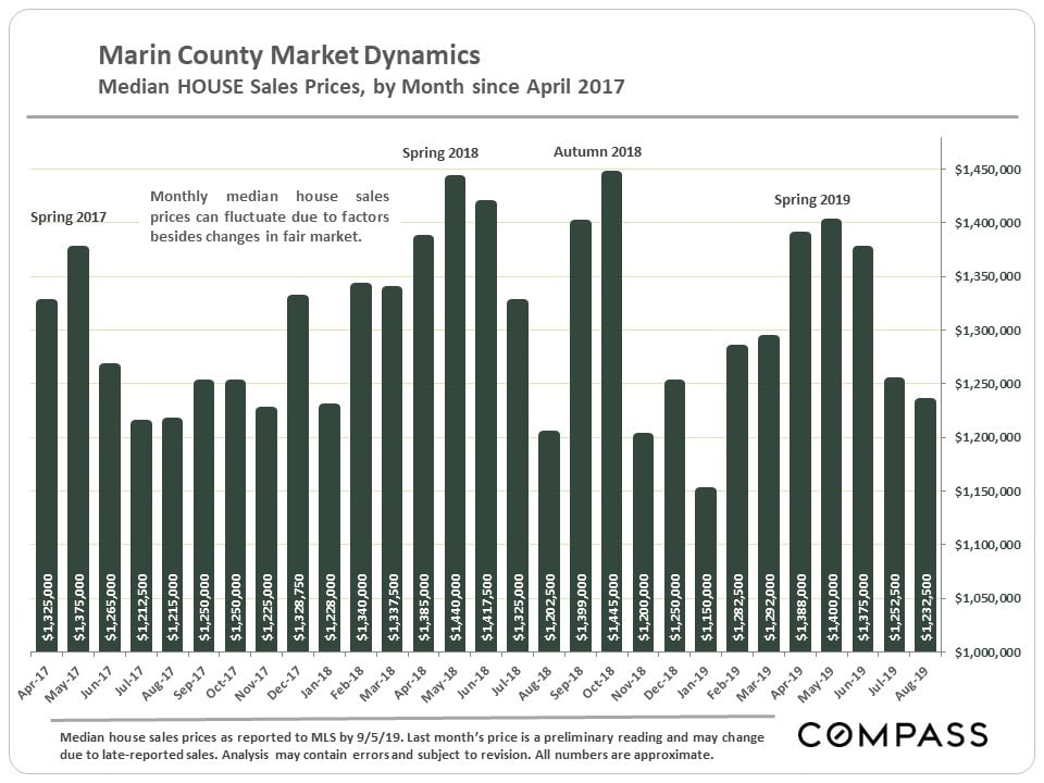 The chart below compares supply, the number of active listings on the market, with demand, as measured by the number of sales. This is a seasonally adjusted graph that smooths out normal monthly fluctuations to provide clearer historical trend lines. As context, the data below begins in 2013, after the market recovery was already well underway. If the data went back to the 2009 – 2011 period, during the post-crash market recession, the divergence between the two lines would be much, much greater than at any time illustrated here. (Note that the seasonally adjusted data on Marin monthly sales volume is still a few months behind.)