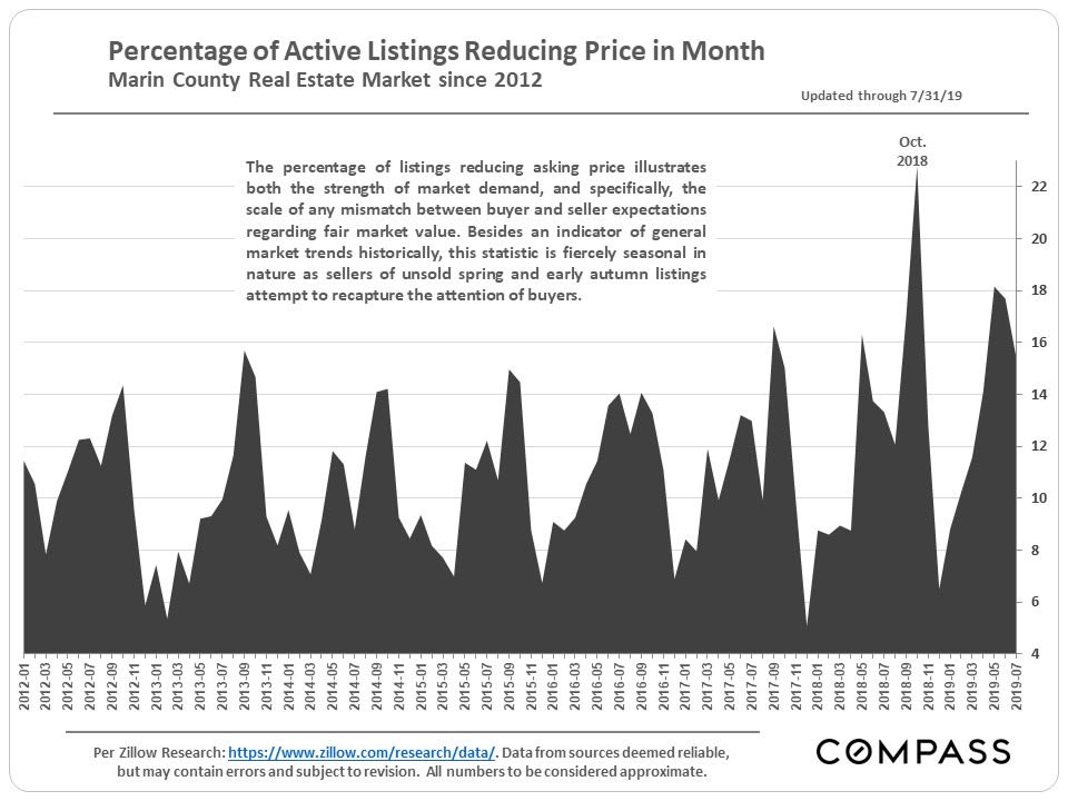 Generally speaking, the percentage of active listings undergoing price reductions spiked in mid-2018 and has remained somewhat elevated since then. The big factor behind the spike was that the late 2017/ early 2018 market was very hot. When the market began to cool off, sellers and listing agents – relying upon recent sales data to set new listing prices – were wrong-footed by the softening in supply and demand dynamics. Sometimes, it takes a while to adjust pricing to changing market realities.