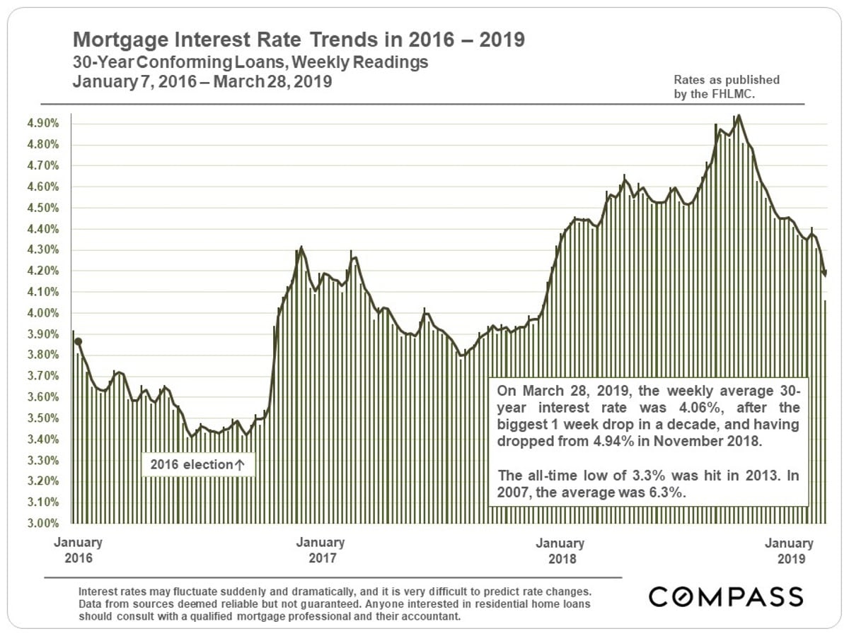 There has been a stunning decline in mortgage interest rates from mid-November 2018 through the end of March, from 4.94% to 4.06% - to the enormous advantage to buyers. Big drops such as this have helped to recharge buyer demand in the past.