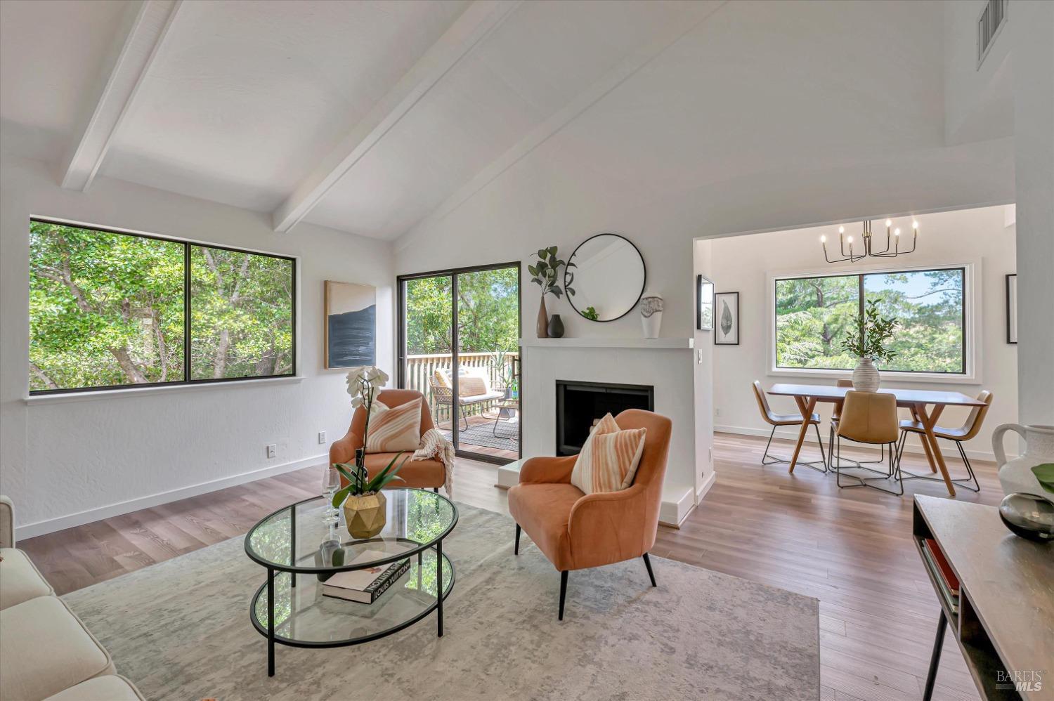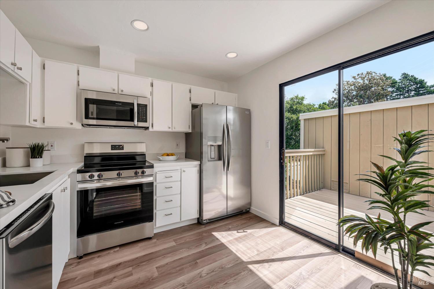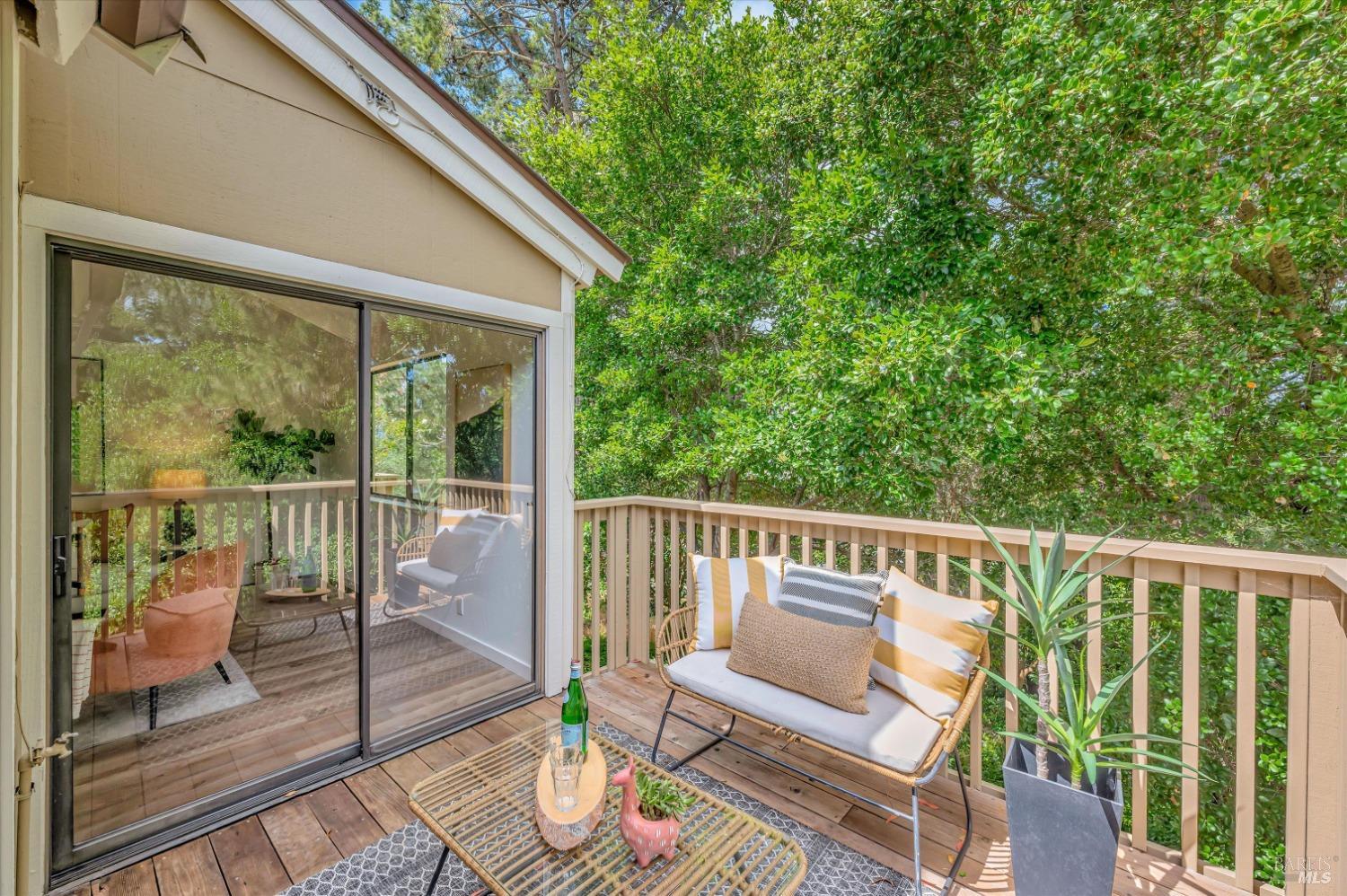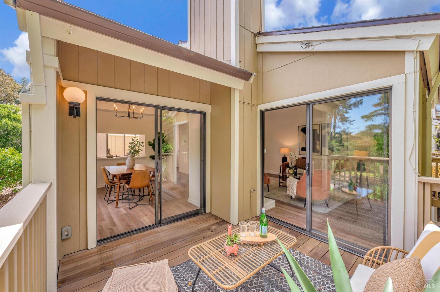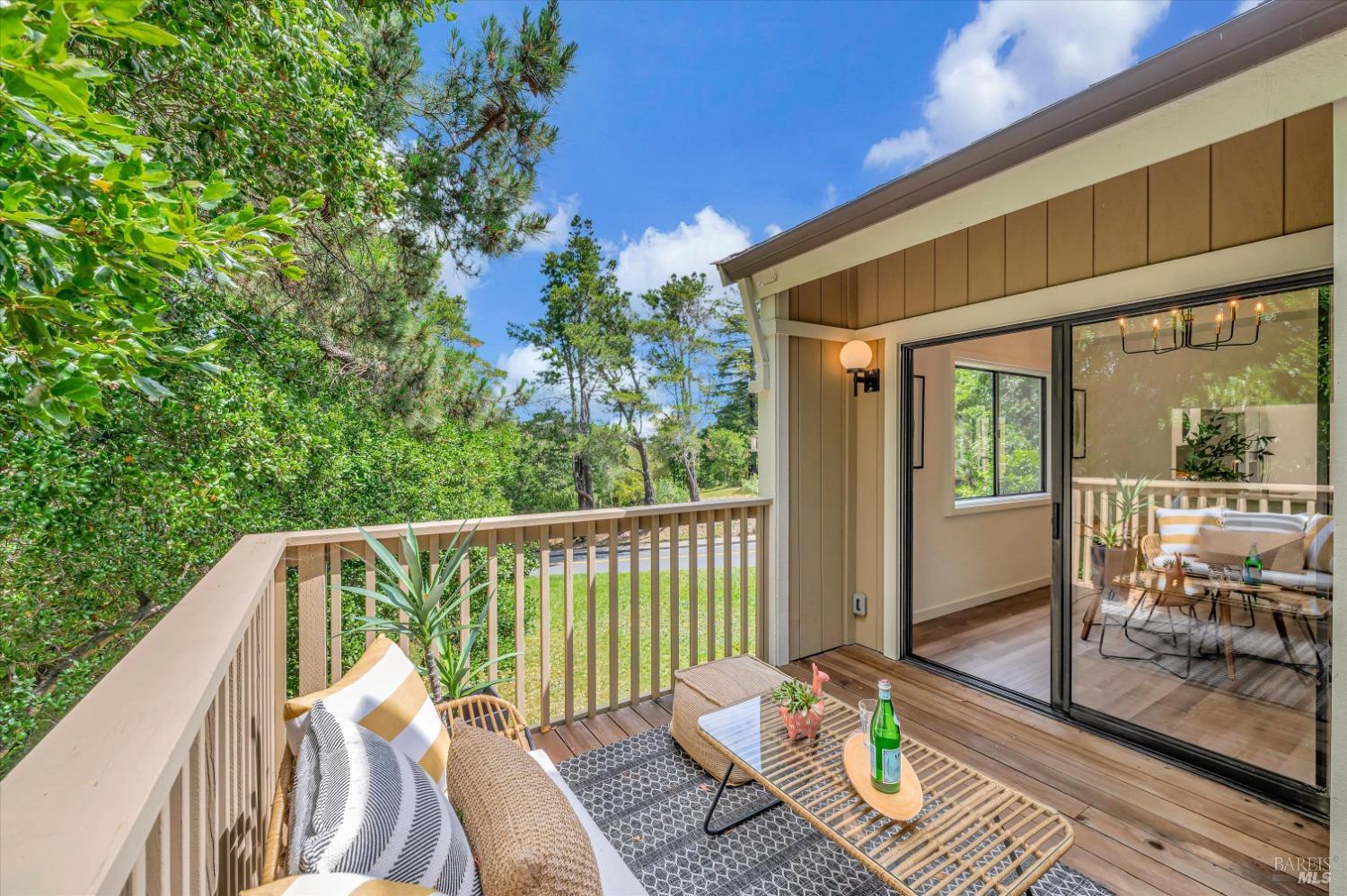 Move right into this 3 BR 2 BA newly renovated Shelter Ridge townhome featuring vaulted beam ceilings, 3 decks, and a 2-car carport with storage. Surrounded by trees, this light-filled 1356 sq. ft. end unit is freshly painted, and has new flooring, kitchen appliances, bathroom vanities, kitchen and bathroom countertops, lighting, and fixtures. Luxury vinyl plank flooring covers the living room, kitchen, and dining areas upstairs, and all three bathrooms, and Berber carpet the bedroom floors downstairs. New quartz countertops complement the just-installed stainless steel kitchen appliances, with the same countertops in the bathrooms. Additionally, the home's exterior was fully repaired and painted in late 2023. The Shelter Ridge clubhouse, pool, and tennis courts afford a space for year-round relaxation, and--unique to this 184-unit planned development---numerous paths in 40 acres of maintained residential and open space are a few steps from every unit. Local shopping, services, and Hwy 101 are minutes away, and close by are award-winning schools, the Mill Valley Recreation Center and community garden, sports fields, a playground, a marsh preserve, dog-friendly trails, and a multi-use pathway leading to Sausalito. It's a beautifully renovated home in an ideal location!