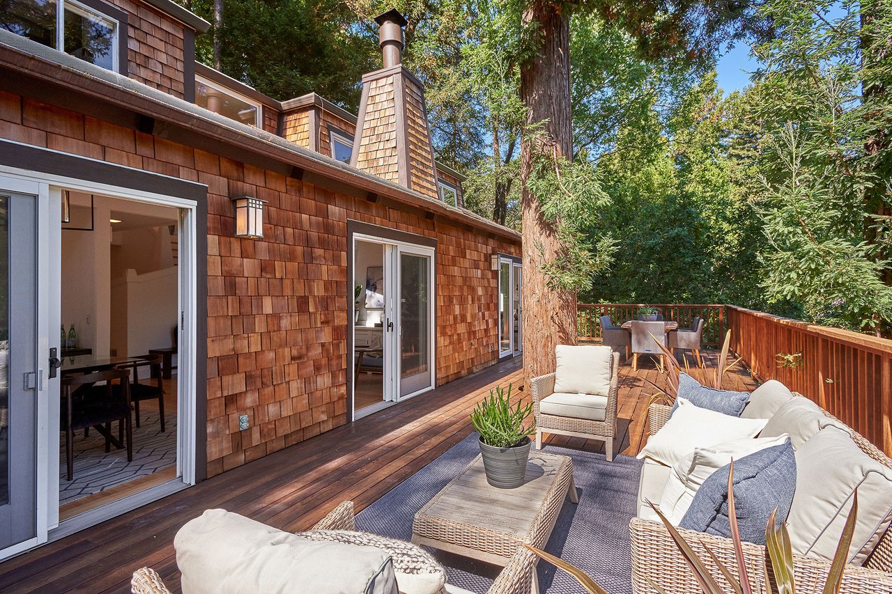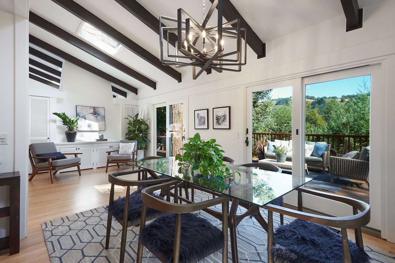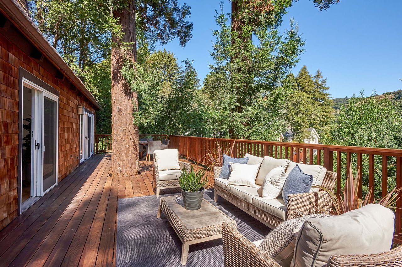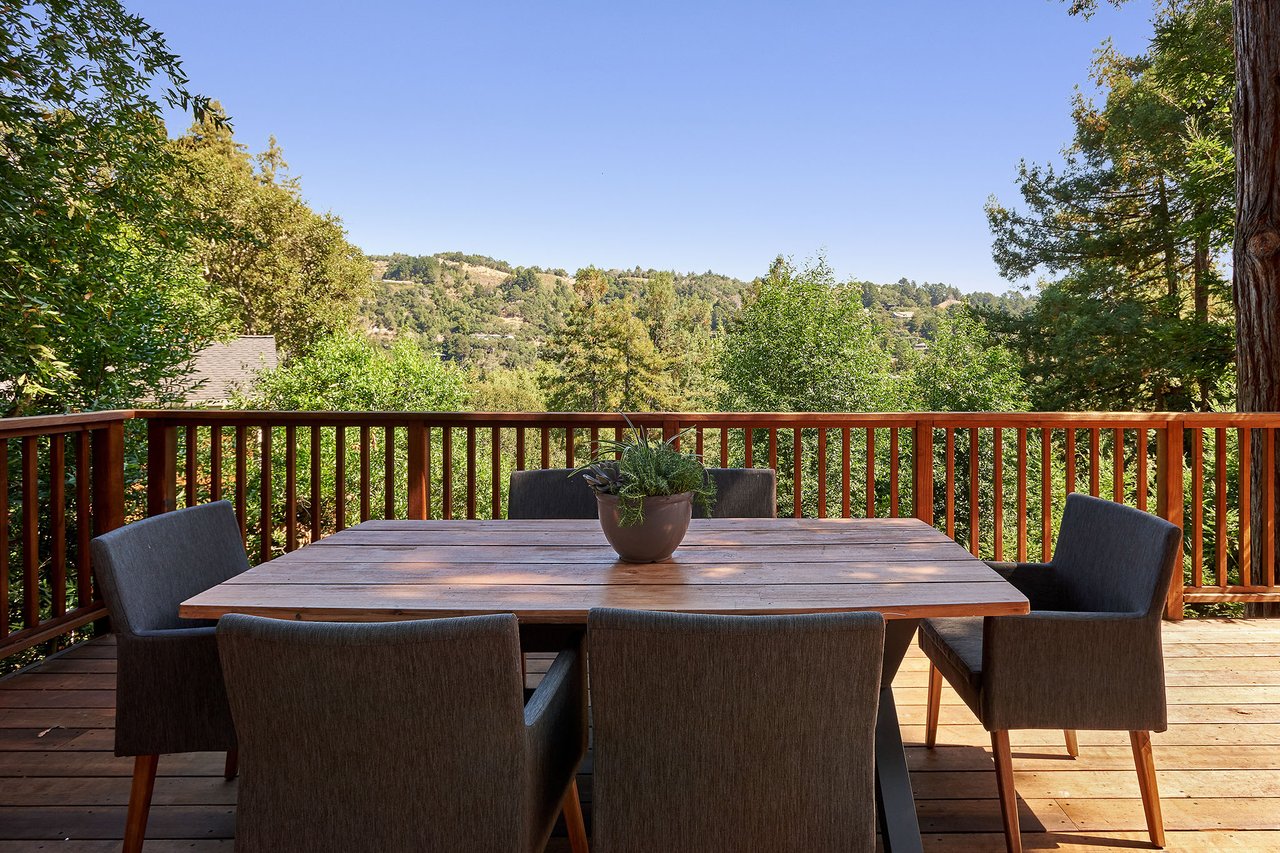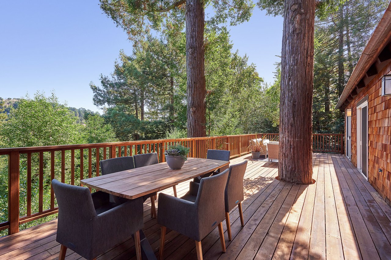 Flooded in natural sunlight, the main level features newly refinished hardwood floors, tall beamed ceilings, a spacious dining room and living room with a wood burning fireplace, a large remodeled kitchen with cherry cabinets, granite counter tops and stainless steel appliances, and a powder room. The expansive full-width walk out deck for entertaining, overlooks the redwood trees and valley beyond. The Master suite, complete with double sinks and stone finishes, completes this floor.