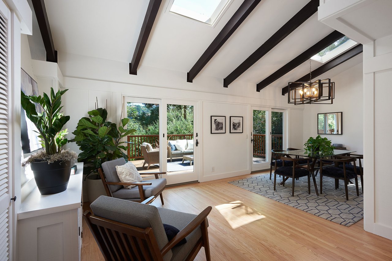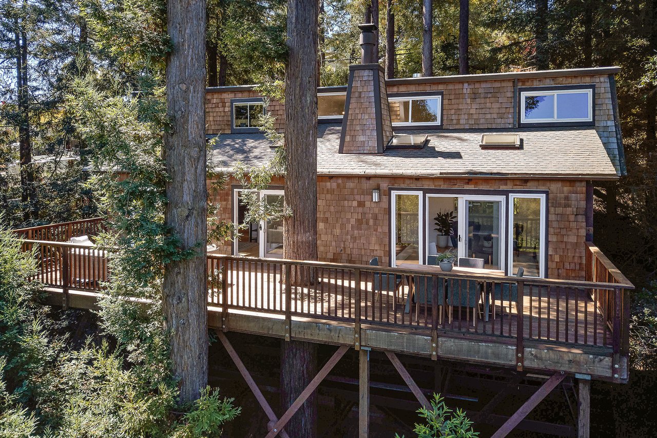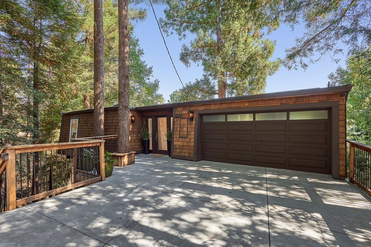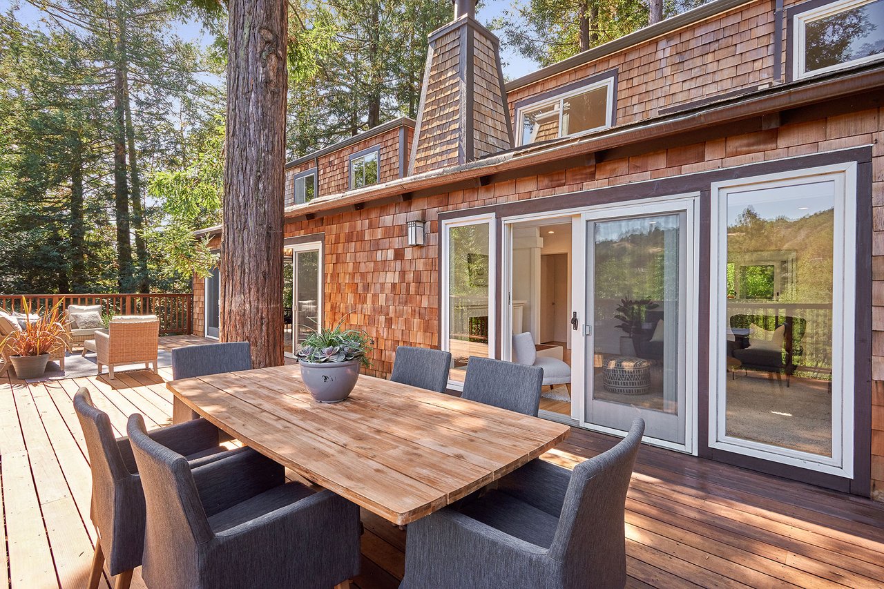 Flooded in natural sunlight, the main level features newly refinished hardwood floors, tall beamed ceilings, a spacious dining room and living room with a wood burning fireplace, a large remodeled kitchen with cherry cabinets, granite counter tops and stainless steel appliances, and a powder room. The expansive full-width walk out deck for entertaining, overlooks the redwood trees and valley beyond. The Master suite, complete with double sinks and stone finishes, completes this floor.