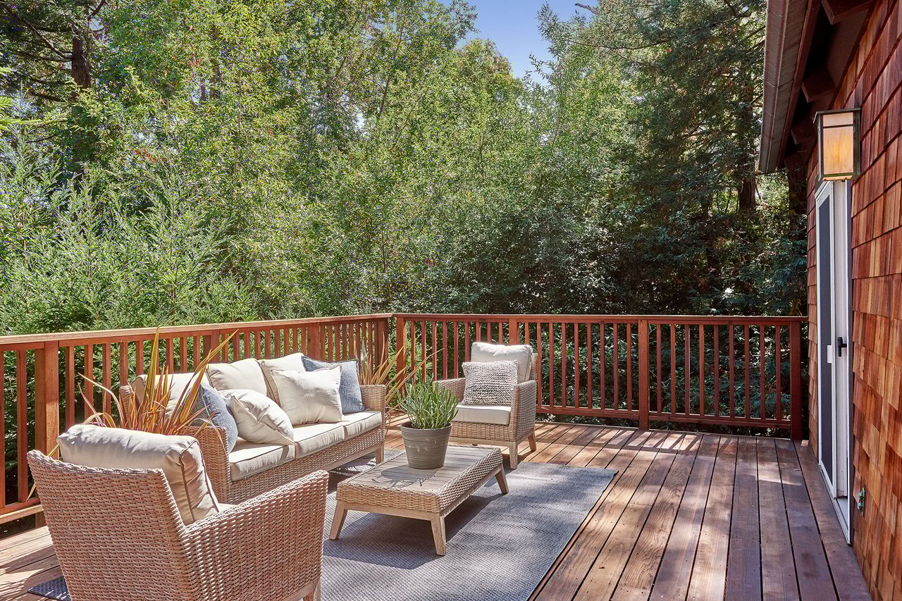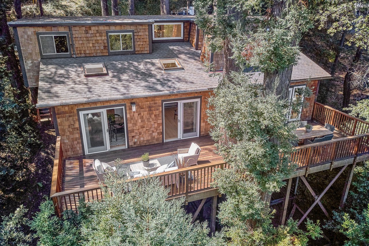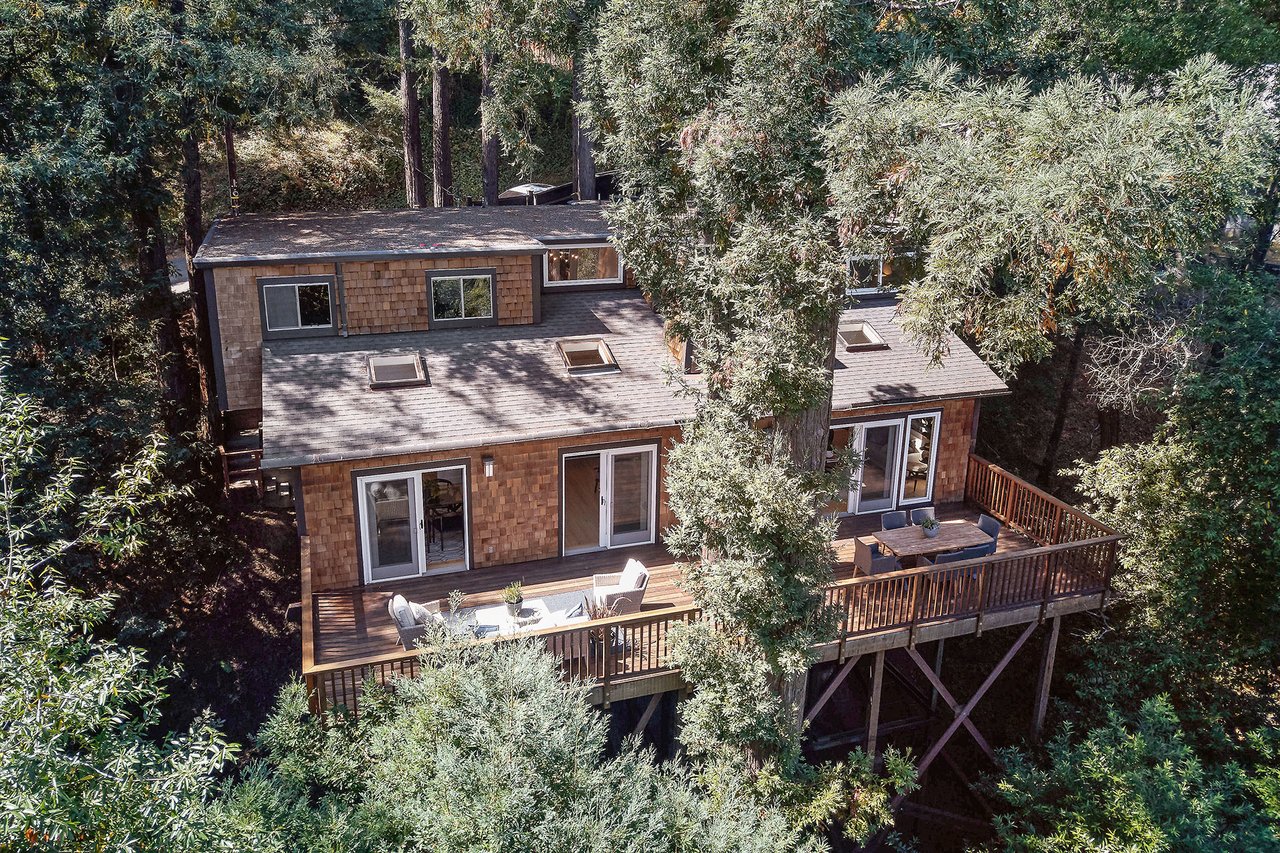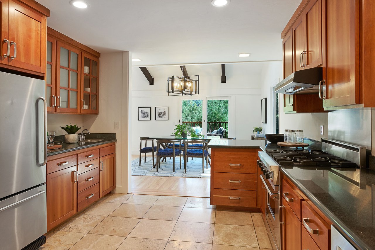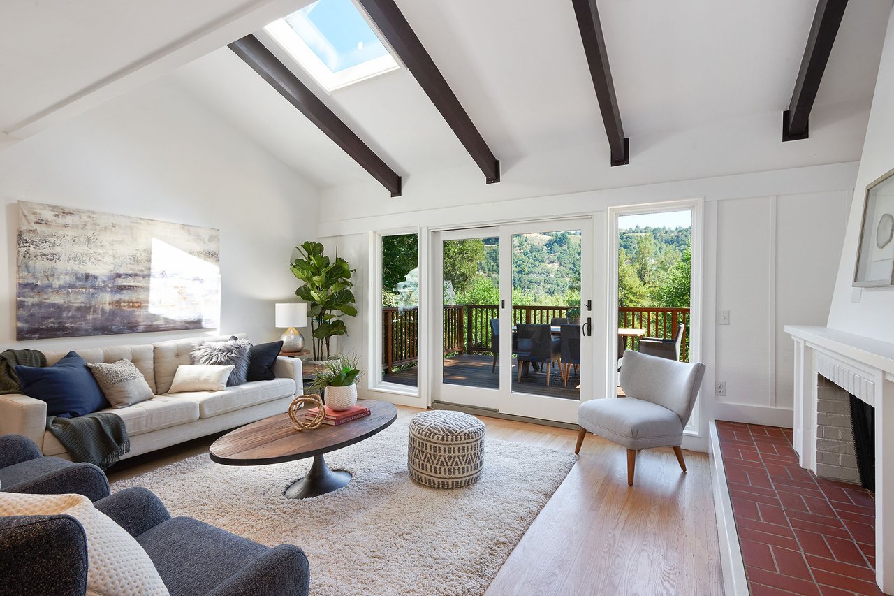Flooded in natural sunlight, the main level features newly refinished hardwood floors, tall beamed ceilings, a spacious dining room and living room with a wood burning fireplace, a large remodeled kitchen with cherry cabinets, granite counter tops and stainless steel appliances, and a powder room. The expansive full-width walk out deck for entertaining, overlooks the redwood trees and valley beyond. The Master suite, complete with double sinks and stone finishes, completes this floor.