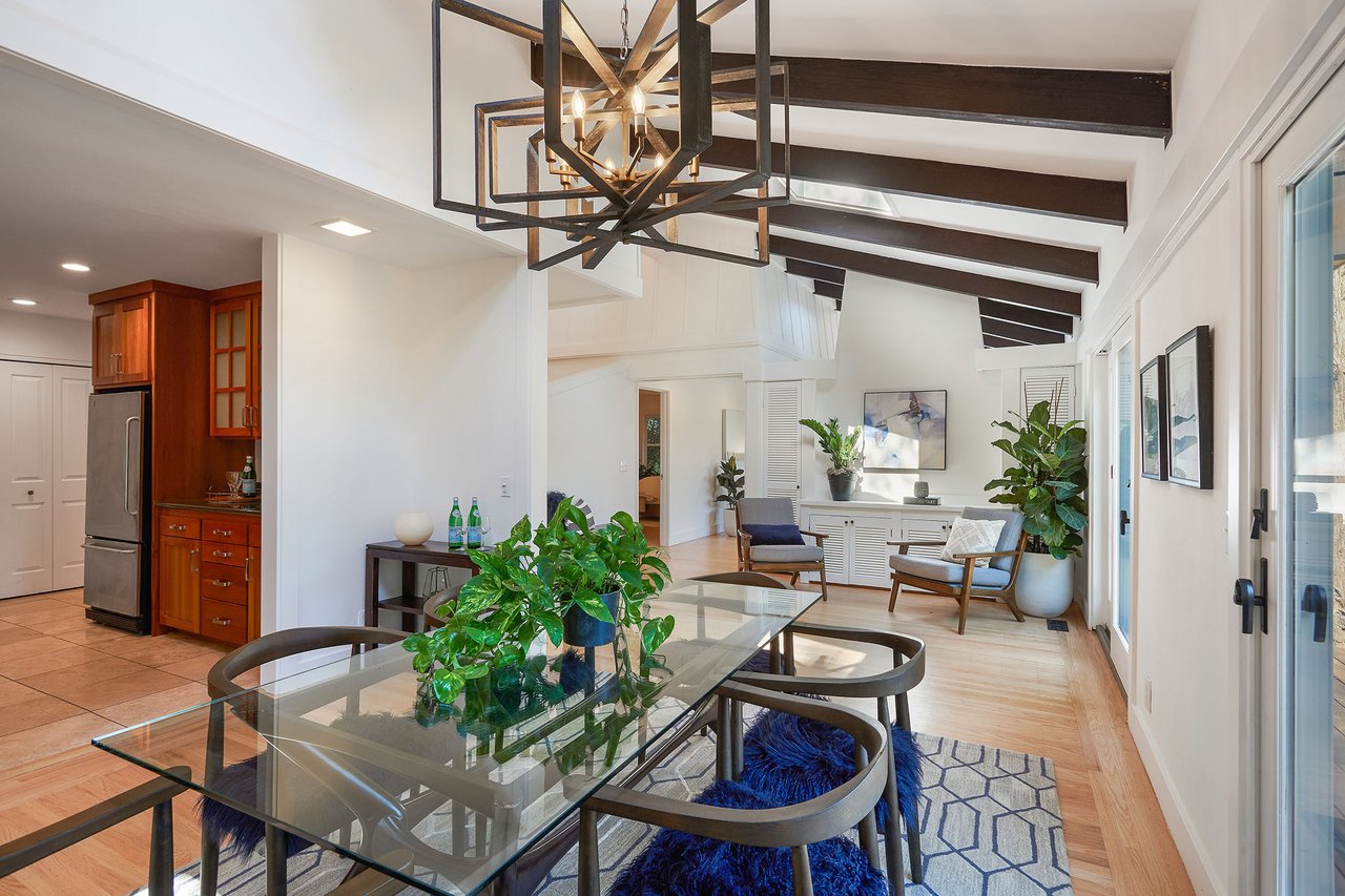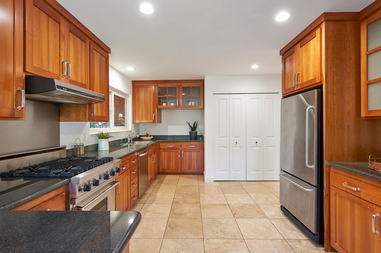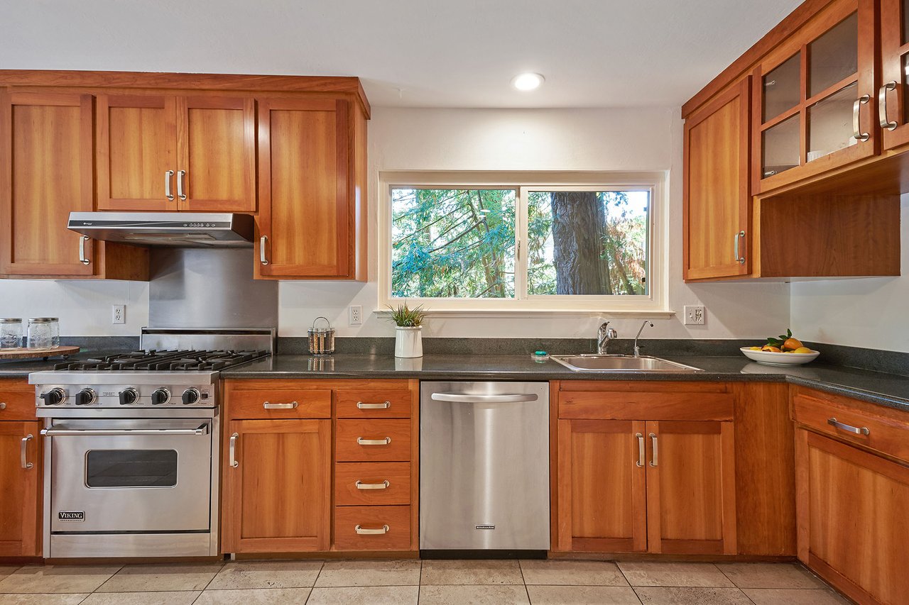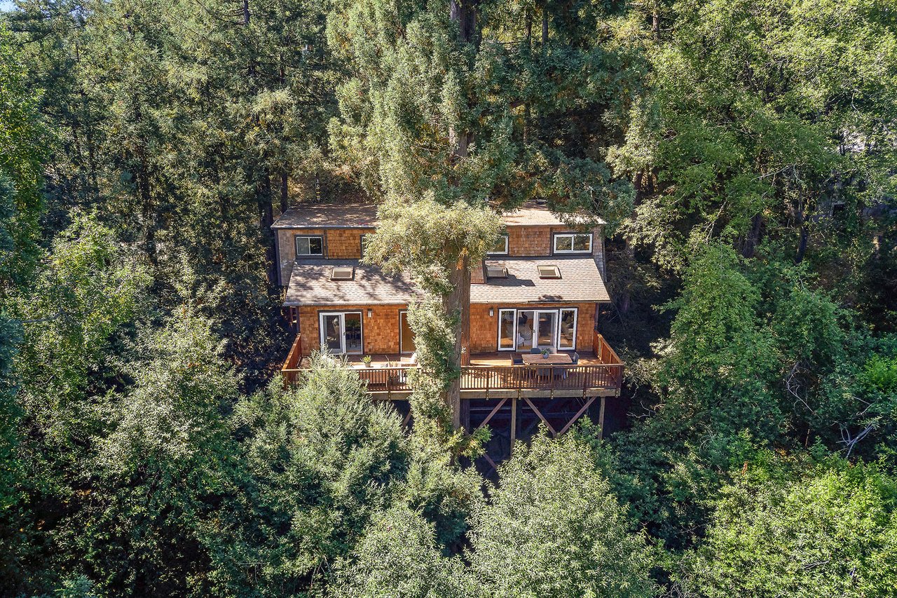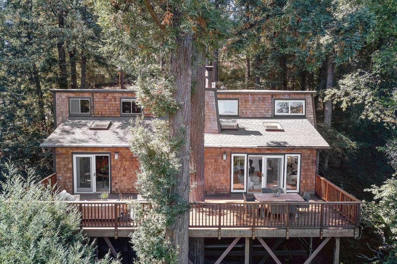 Flooded in natural sunlight, the main level features newly refinished hardwood floors, tall beamed ceilings, a spacious dining room and living room with a wood burning fireplace, a large remodeled kitchen with cherry cabinets, granite counter tops and stainless steel appliances, and a powder room. The expansive full-width walk out deck for entertaining, overlooks the redwood trees and valley beyond. The Master suite, complete with double sinks and stone finishes, completes this floor.