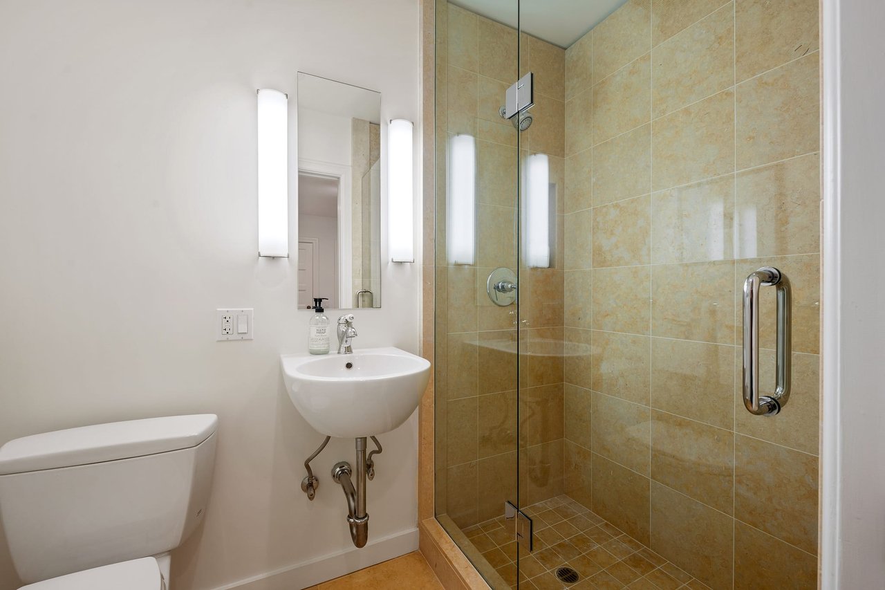 The large Master suite features vaulted ceilings and numerous windows as well as a large walk in closet and an additional smaller closet. The master bathroom features a soaking tub and separate walk in shower with limestone and satin nickel finishes throughout. There are also two additional bedrooms with ample built in closets and a recently remodeled full bathroom completing this level.