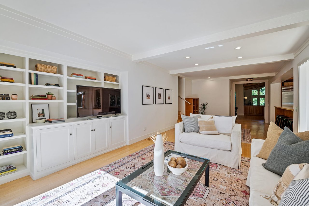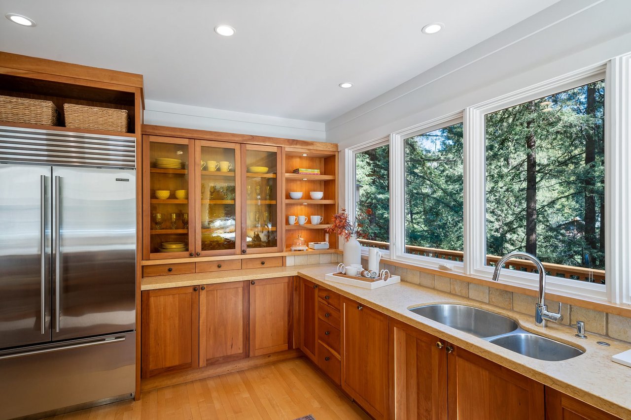 Combining traditional character with modern sophistication and featuring a wonderful sought after open floor plan, with high ceilings and lots of natural light throughout. The stunning living room has vaulted and beamed ceilings, wide plank fir floors with concrete accents, French doors opening to a walk out deck as well as a wood-burning fireplace with vintage surround. The large dining room offers ample space to accommodate large family gatherings.The open plan kitchen with breakfast counter, features custom wood cabinetry, stone countertops, high end stainless steel appliances as well as plenty of storage cabinets and a large walk in pantry as well! An additional casual eating area opens to the large family room with built in book shelves and French doors leading out to the deck and overlooking the garden. The grand entertaining deck receives good natural light and overlooks the majestic redwood trees and Cascade Canyon below, a perfect place to enjoy al fresco dining.