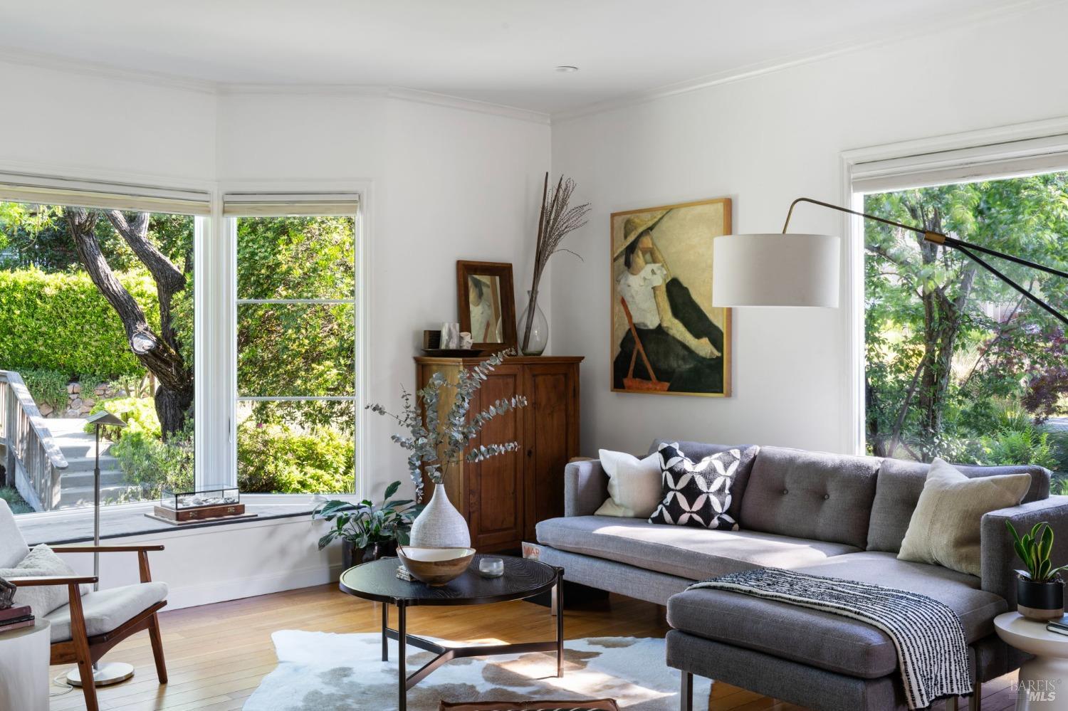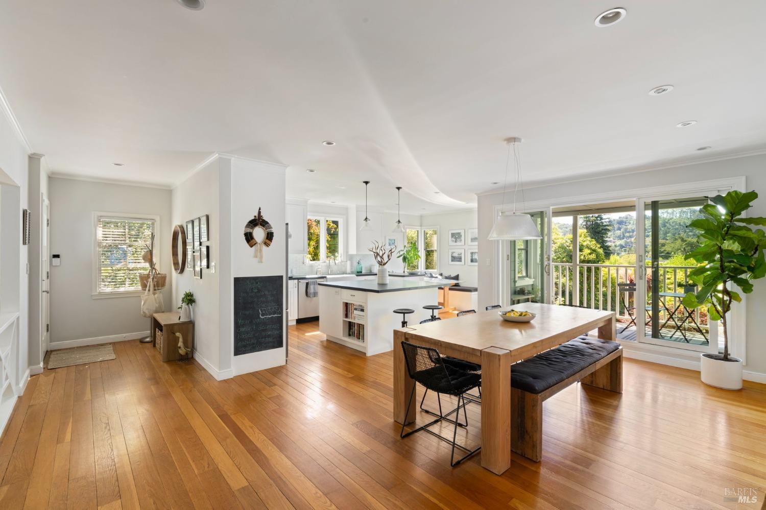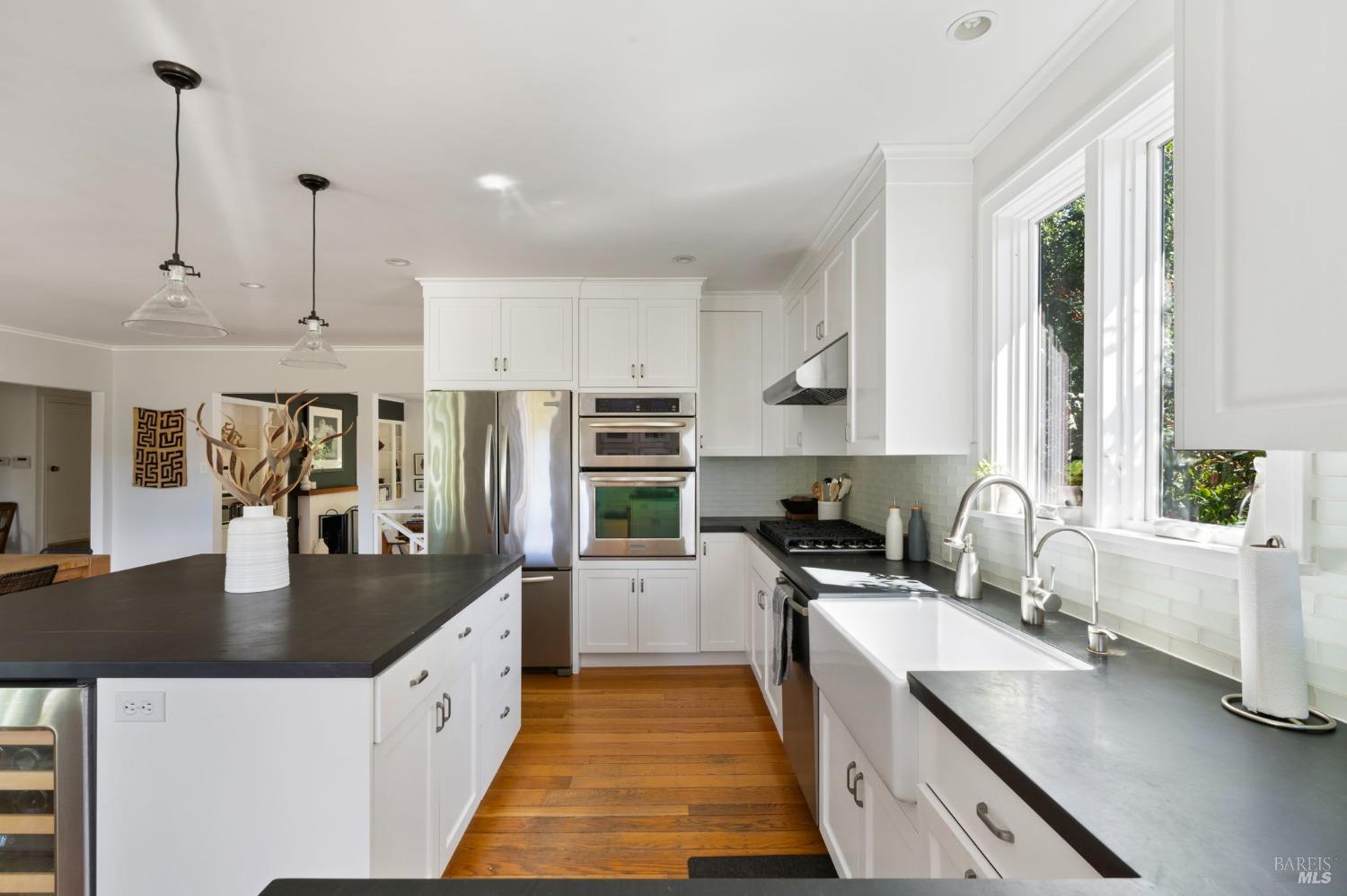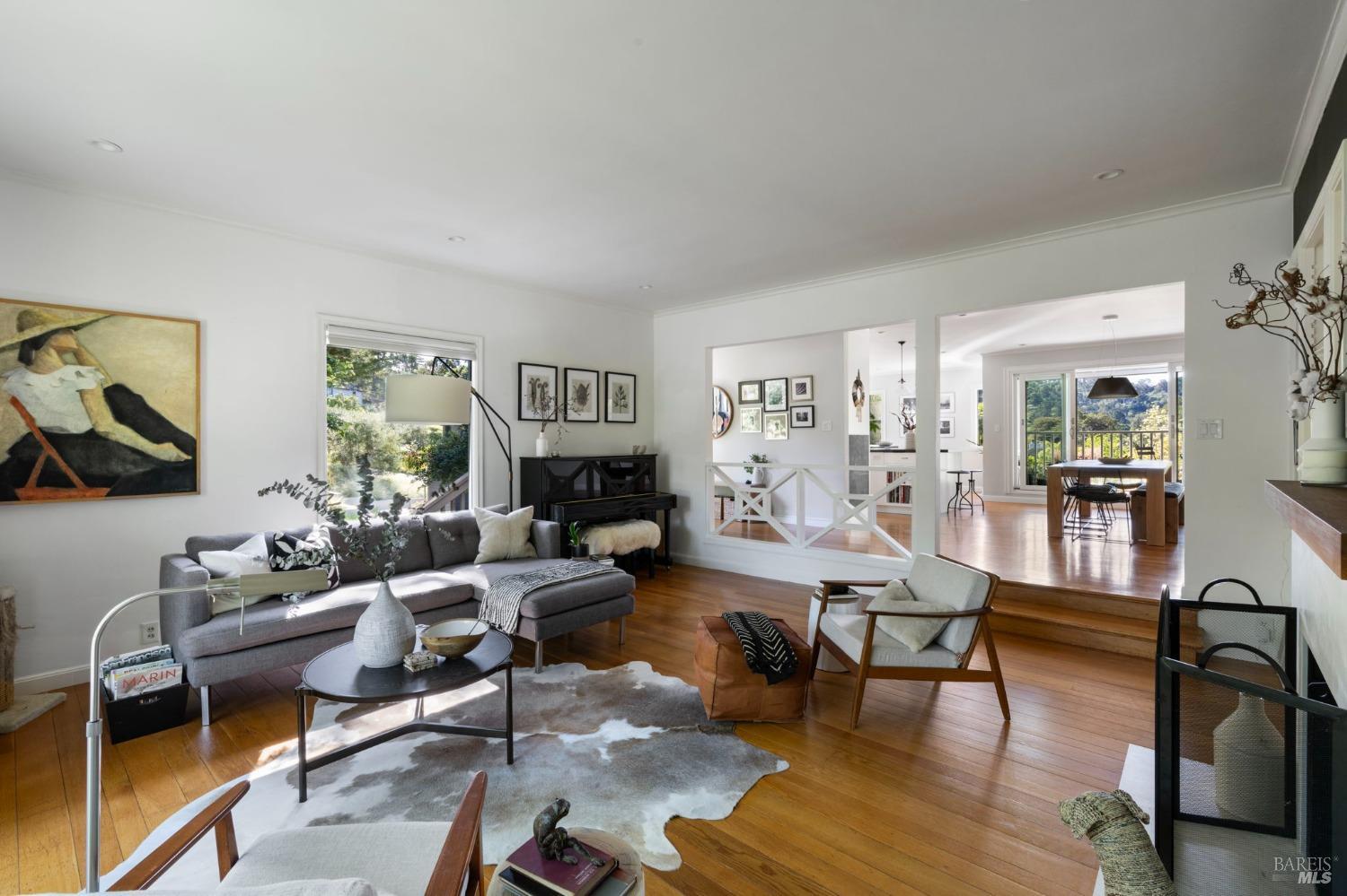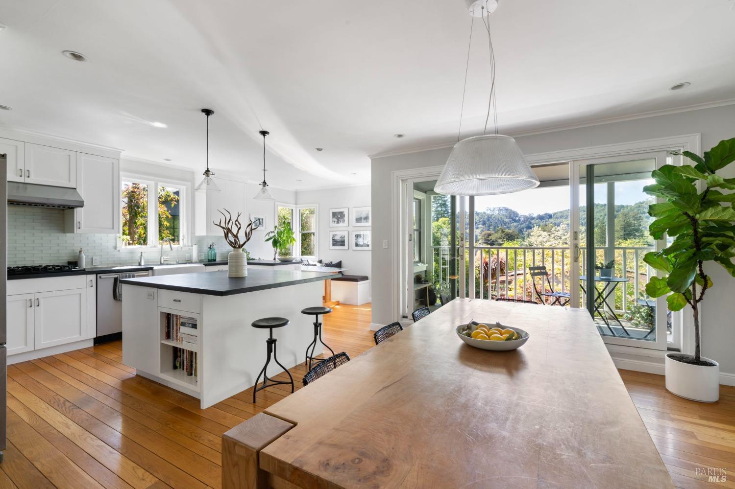 Perfectly located in the coveted lower Palm Hill neighborhood of Larkspur, this stylish, bright, remodeled residence is exactly what buyers have been looking to find. The beautifully remodeled kitchen features a large center island with bar seating, stainless steel appliances, a Viking 6-burner cooktop with hood, a farmhouse sink and an eat-in breakfast area. A large dining area, comfortably seating 10 people, opens up to a serene deck with gorgeous south facing views. This floor includes the primary suite another large bedroom and bath and a gorgeous, large living room with a wood burning fireplace. The lower level has two bedrooms, a bath, a spacious family room, and an oversized garage w/ Tesla charger. The backyard is a lush private oasis with a flat lawn centered by a giant Persimmon tree, an entertaining/dining area bordered by blue stone walls, a raised garden bed, playhouse, and even a chicken coop/bunny hutch. Conveniently situated in one of the most sought-after locations in Marin, 21 Bayview is just a few blocks away from downtown Larkspur's vibrant restaurants, local cafes, and chic shops, as well as the massive Town Park, bike path, world-class hiking and biking trails, the award-winning schools (Neil Cummins Elementary, Marin Primary, Hall Middle, and Redwood High.