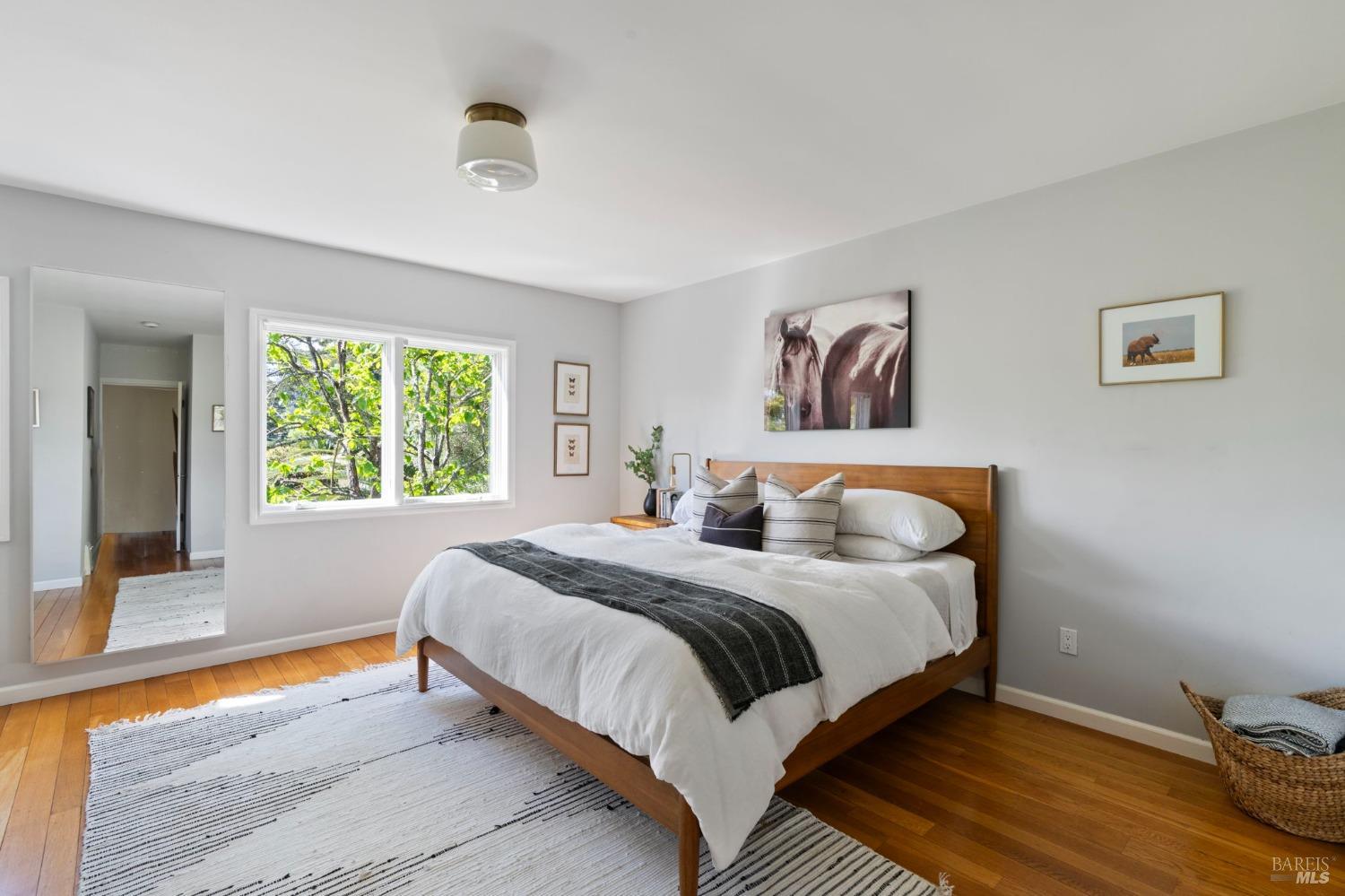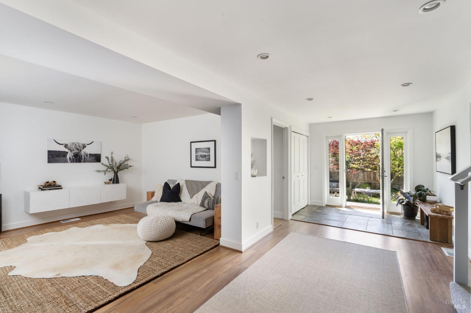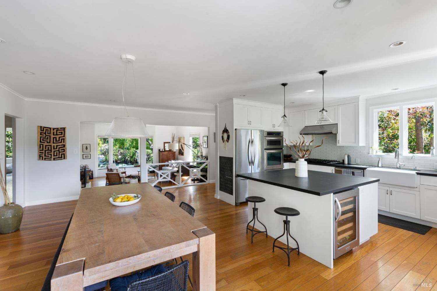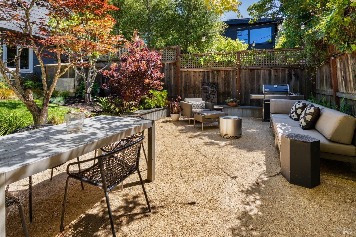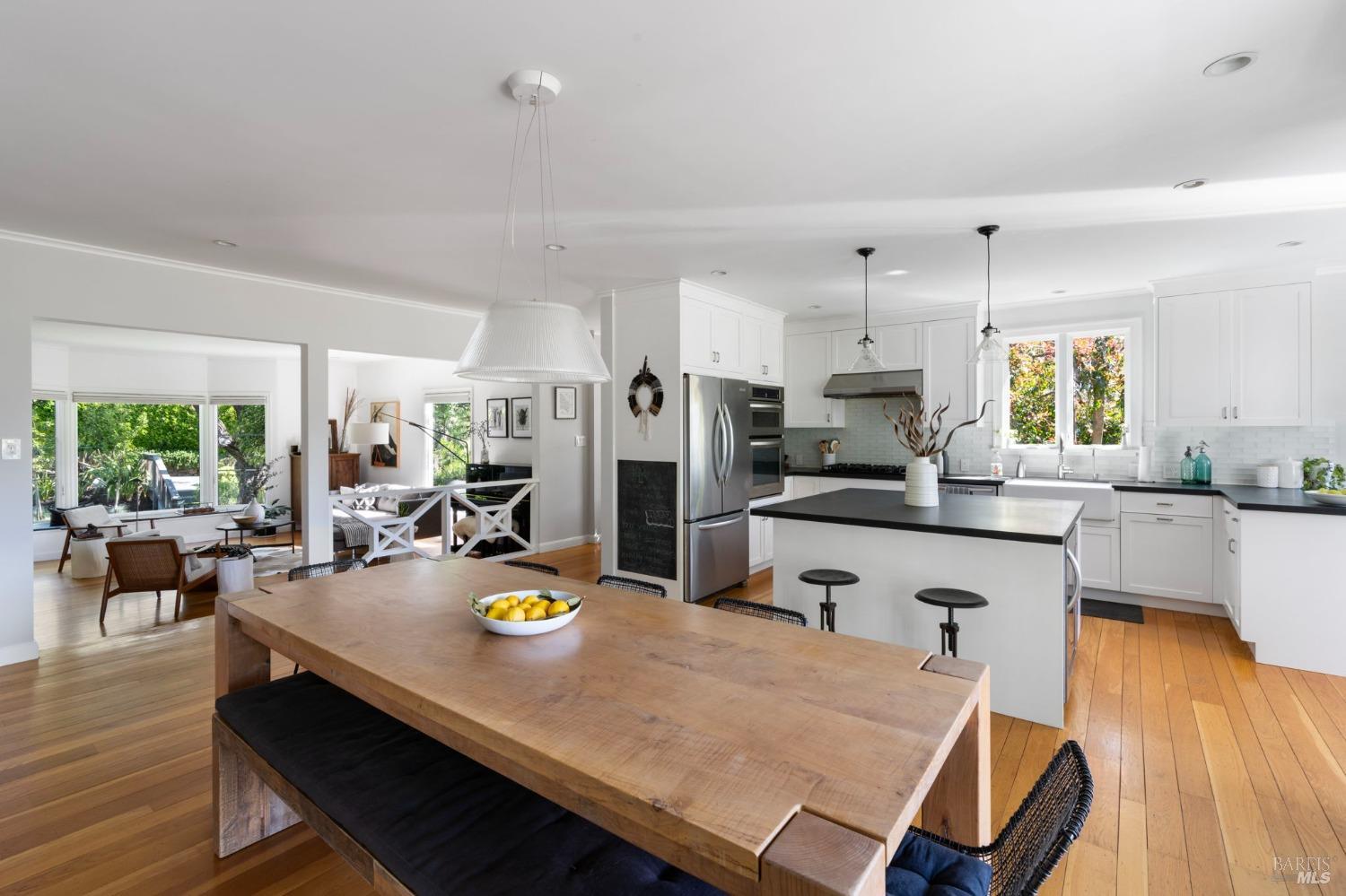 Perfectly located in the coveted lower Palm Hill neighborhood of Larkspur, this stylish, bright, remodeled residence is exactly what buyers have been looking to find. The beautifully remodeled kitchen features a large center island with bar seating, stainless steel appliances, a Viking 6-burner cooktop with hood, a farmhouse sink and an eat-in breakfast area. A large dining area, comfortably seating 10 people, opens up to a serene deck with gorgeous south facing views. This floor includes the primary suite another large bedroom and bath and a gorgeous, large living room with a wood burning fireplace. The lower level has two bedrooms, a bath, a spacious family room, and an oversized garage w/ Tesla charger. The backyard is a lush private oasis with a flat lawn centered by a giant Persimmon tree, an entertaining/dining area bordered by blue stone walls, a raised garden bed, playhouse, and even a chicken coop/bunny hutch. Conveniently situated in one of the most sought-after locations in Marin, 21 Bayview is just a few blocks away from downtown Larkspur's vibrant restaurants, local cafes, and chic shops, as well as the massive Town Park, bike path, world-class hiking and biking trails, the award-winning schools (Neil Cummins Elementary, Marin Primary, Hall Middle, and Redwood High.